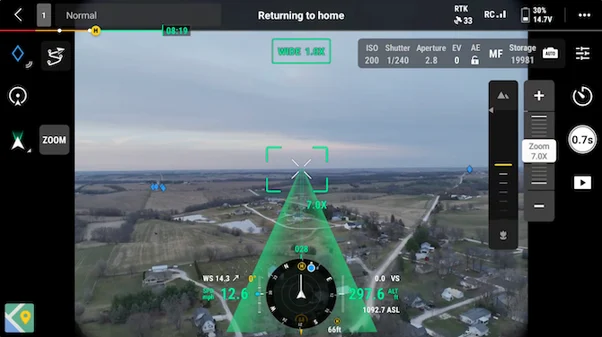 If you enable the “Show AR Return-to-Home Route” feature on your drone, it will automatically adjust the gimbal’s tilt angle so that the camera is facing in the direction of its home location. When these settings are enabled the camera will display the AR Home Point and AR Return-to-Home Route. This feature helps you to see any obstacles and provides an overview of the home point and its route for returning home.