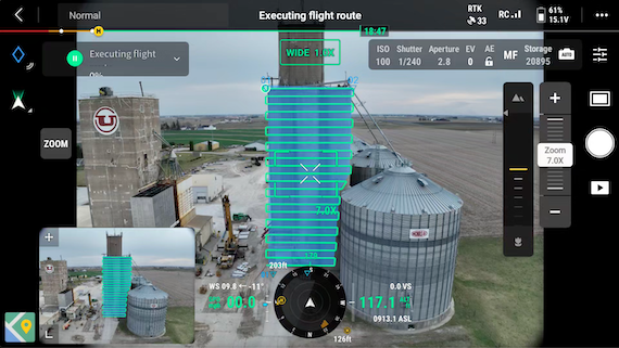 The pilot used a Mavic 3E to create a detailed model of a grain facility using a GSD of 1cm. Once the model was generated, it was uploaded to FlightHub 2, which processed the data into a local rendering. This rendering provided a clear and accurate depiction of the current state of the grain facility